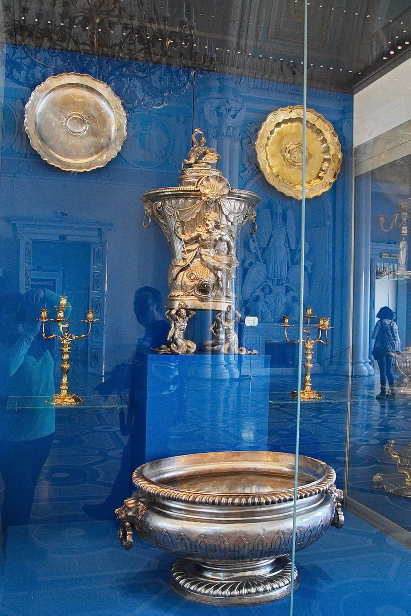 Настоящий шедевр коллекции — блюдо, использовавшееся для украшения стола, под названием «Пладеменаж», выполненное во Франции выдающимся ювелиром, придворным мастером Людовика XV Клодом Баленном II. Внимания также заслуживают предметы из так называемого Английского сервиза Екатерины I и двуручный кубок.