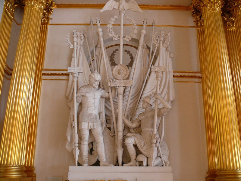 По-прежнему можно увидеть скульптурные группы русских воинов — после пожара 1837 года они были полностью воссозданы. Но гербы губерний на них уже не увидеть. В 1900 году их переместили на семь бронзовых люстр, также производства фабрики Адольфа Морана.