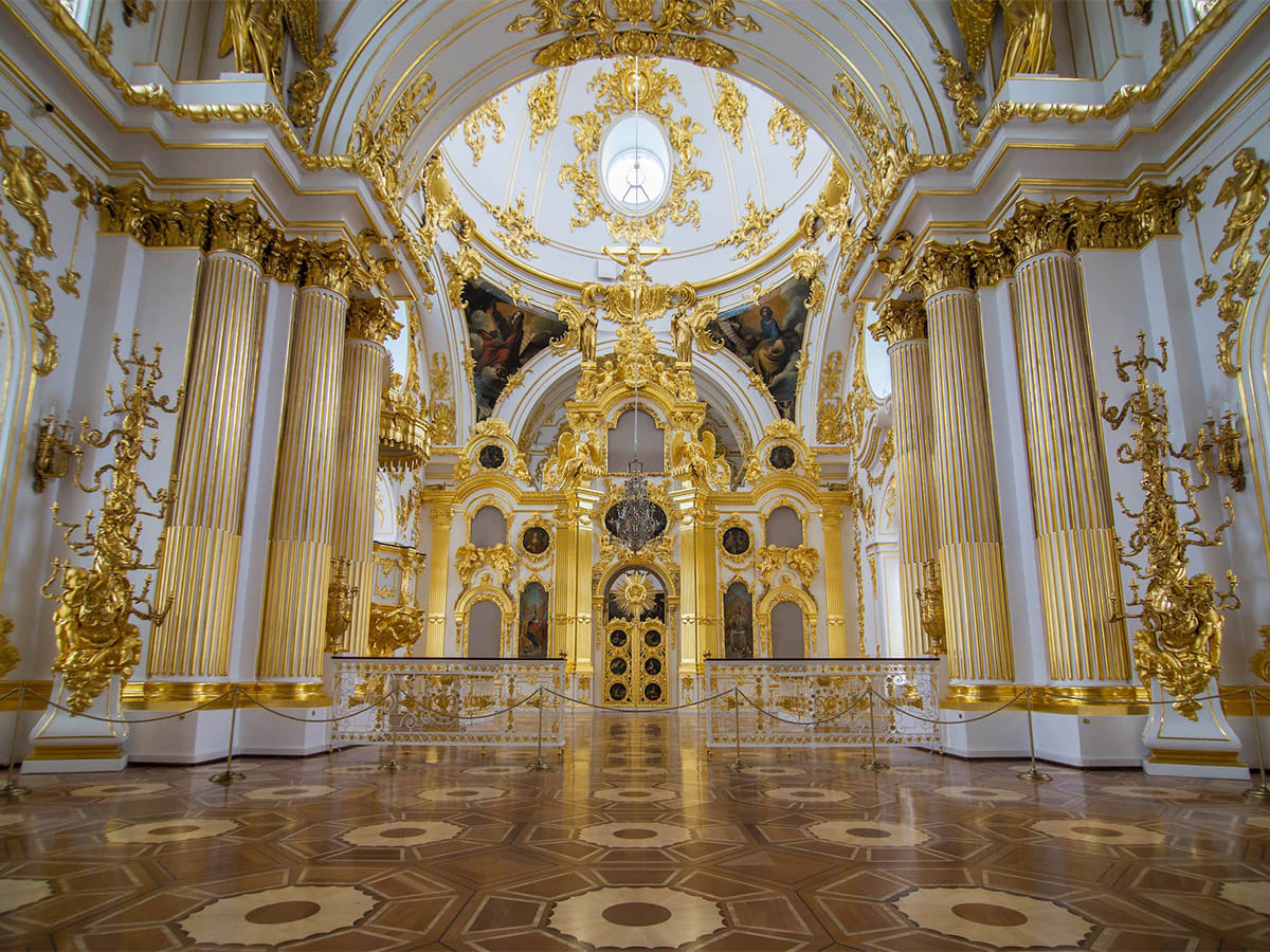 У Большой церкви Зимнего дворца в Эрмитаже, или Придворного собора Спаса Нерукотворного, непростая история. Ей довелось пережить разрушительный пожар и кощунственные преобразования во времена Советского Союза. И хотя в наше время она не выполняет религиозную функцию, благодаря тщательному восстановлению можно увидеть церковь практически такой же, какой её создал гениальный Бартоломео Франческо Растрелли.