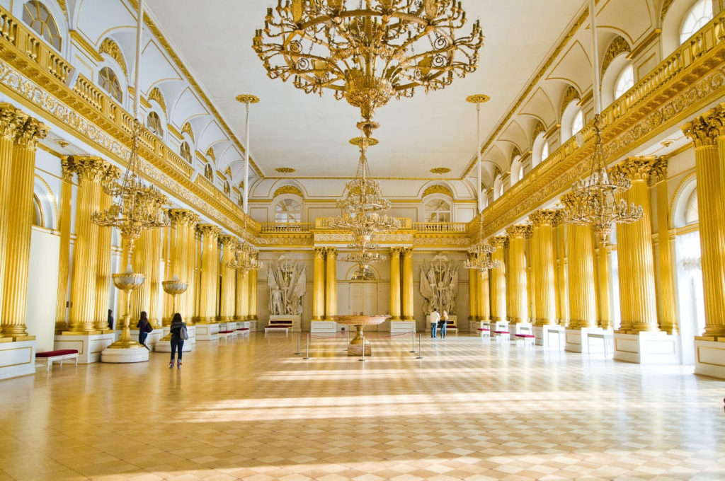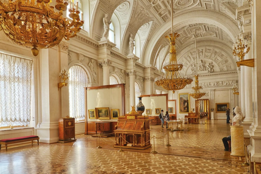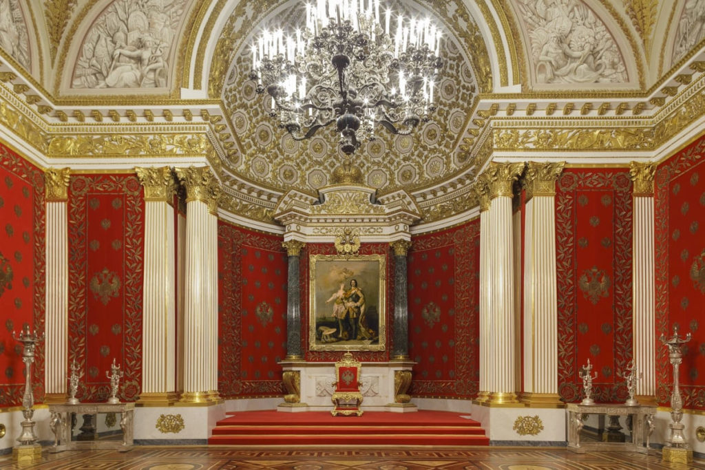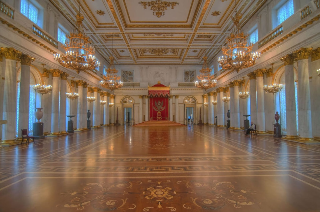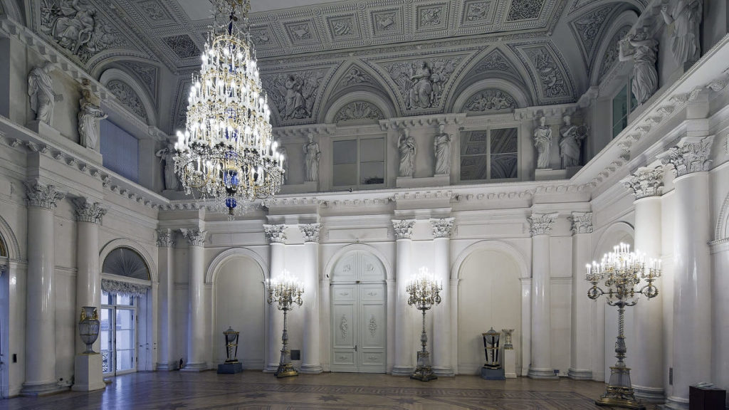 Это самая большая комната Эрмитажа. Зал выглядит строгим и торжественным за счёт отделки из белого мрамора и минимального декора — коринфских капителей на массивных колоннах, резьбы, позолоты на люстрах.