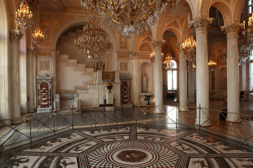 Интерьер включает в себя элементы нескольких стилей — античного, восточного, ренессанса и классицизма. Каждая деталь заслуживает внимания: настенные фонтаны, арочные окна, колоннады, потолочная лепнина, барельефы и мозаики.