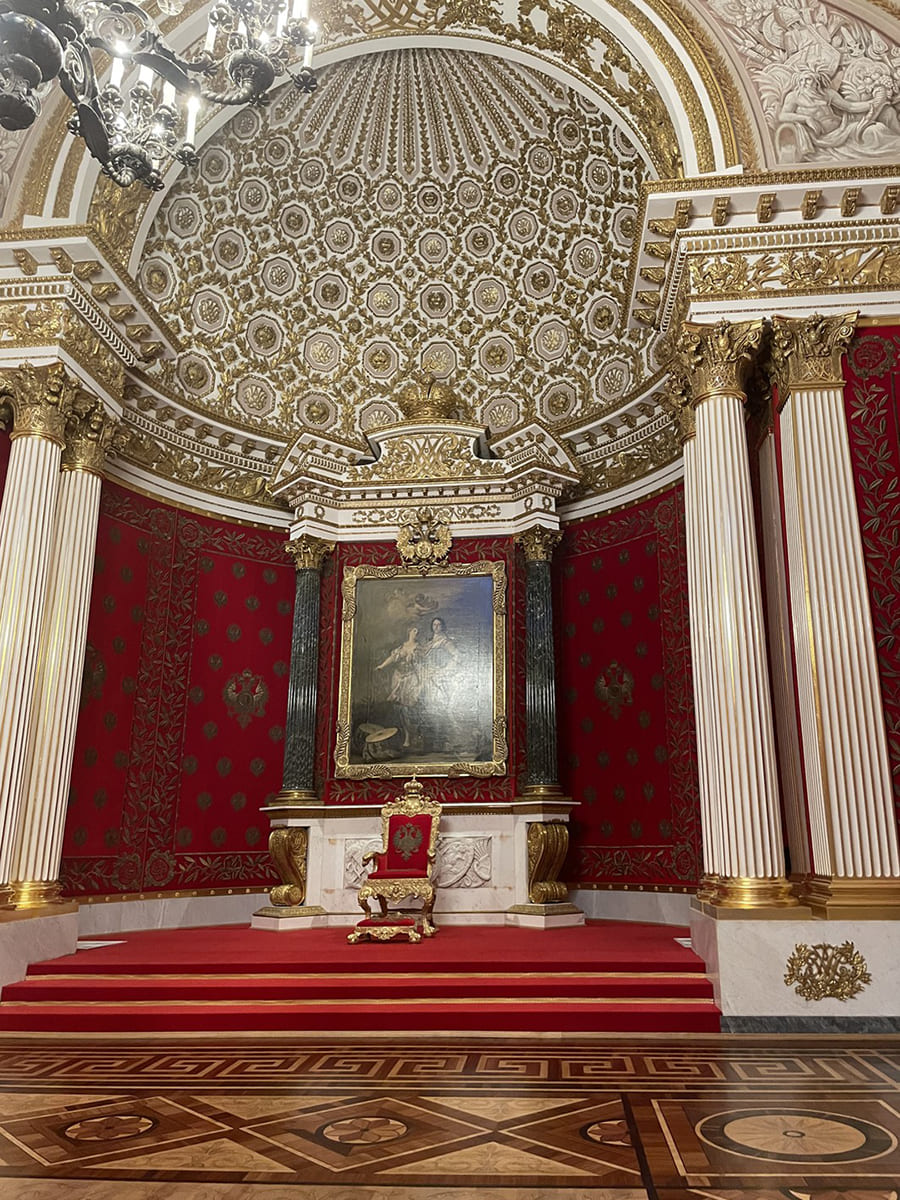 Маршрут начинается с роскошной Иорданской лестницы и небольшой лекции о елизаветинском барокко, главных экспонатах и коллекциях музея, царских интерьерах и известных личностях того времени. Вместе с экскурсоводом вы посетите Военную галерею и галерею Романовых, Большую церковь Зимнего дворца и знаменитые залы Эрмитажа — Малахитовый, Концертный, Петровский, Павильонный, Гербовый, Фельдмаршальский и Большой Тронный.