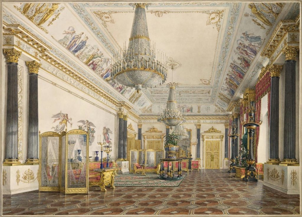 Гостиная была создана в 1837 году для жены императора Николая I Александры Фёдоровны. Она связывала Невскую анфиладу с жилой половиной дворца, где находились покои императрицы. Автор интерьера — Александр Брюллов, профессор архитектуры и художник.