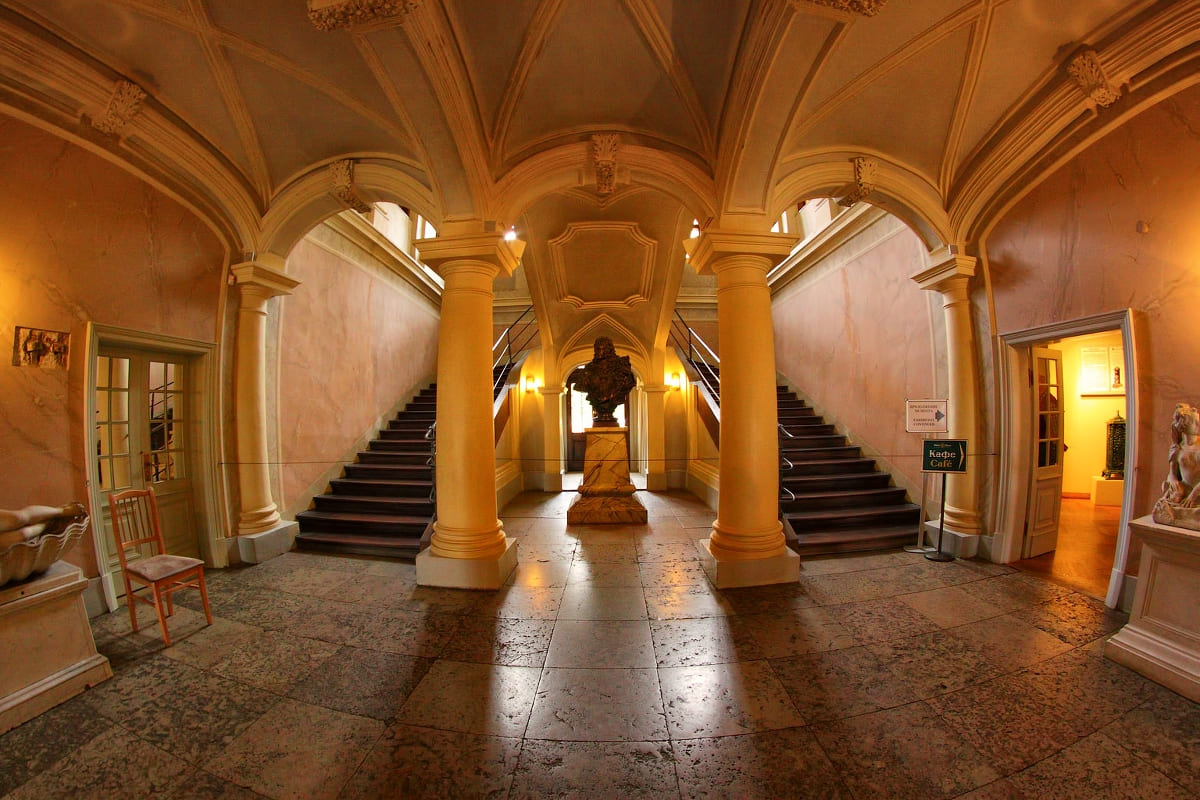 Первое помещение, в которое попадают посетители, называют большие сени. Это парадный вестибюль, построенный в итальянской манере. Проход к лестнице украшают несколько впечатляющих колонн, стены с мраморной росписью и скульптуры в углублениях под дубовой лестницей.