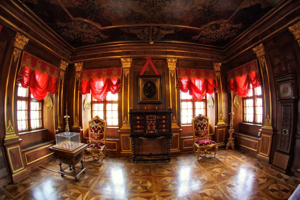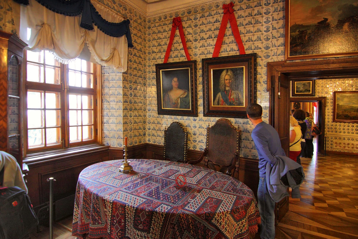 Также в помещении можно увидеть потолочную роспись и оригинальные двери начала XVIII века. Оба интерьерных элемента обнаружили во время реставрации в советский период. В противоположном крыле находятся комната княгини, китайский и красный кабинеты. В каждом из них есть вещи из прошлых веков. Например, в кабинете с живописью сохранился секретер XVII века.