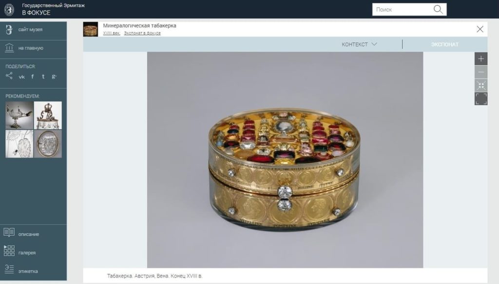 В Государственном Эрмитаже в СПб действует программа образовательных онлайн-ресурсов. В неё входит интернет-проект «В фокусе», который рассказывает о разных коллекциях и экспонатах, а также специфике работы сотрудников музея.