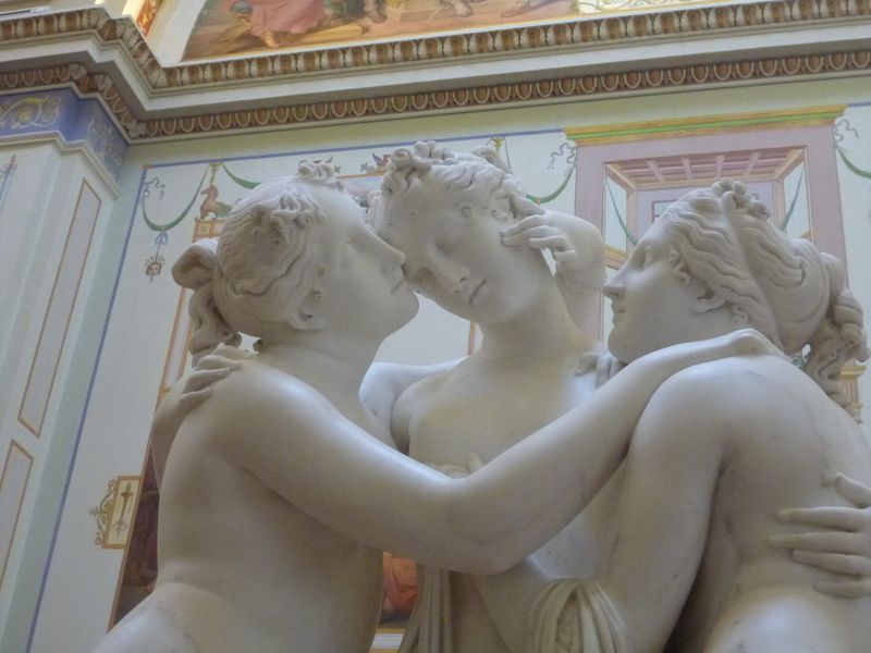 Автор этой скульптуры начала XIX века — итальянец Антонио Канова. В древнегреческой мифологии три грации (их также называют харитами) олицетворяют женскую прелесть, красоту и очарование, а также считаются источниками вдохновения. Это очень популярный античный образ среди многих художников и скульпторов. Однако Канова изобразил богинь по-своему. В традиционной композиции две девушки обращены лицом к зрителю, а третья стоит спиной. У Антонио Кановы все грации повёрнуты в одну сторону и смотрят друг на друга.