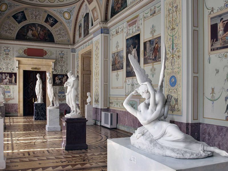 В Эрмитаже можно увидеть две скульптуры с таким названием. Одну из них в конце XVIII века сделал Антонио Канова. Его работа основана на сюжете римского писателя Апулея. Прекрасная Психея, возлюбленная Амура, отправилась в подземное царство, чтобы принести богине Венере сосуд с красотой. Девушке нельзя было заглядывать внутрь сосуда, но она ослушалась и погрузилась в вечный сон. Психею вернул к жизни Амур, который спустился с неба и поцеловал её. Именно этот момент демонстрирует скульптура Кановы.
