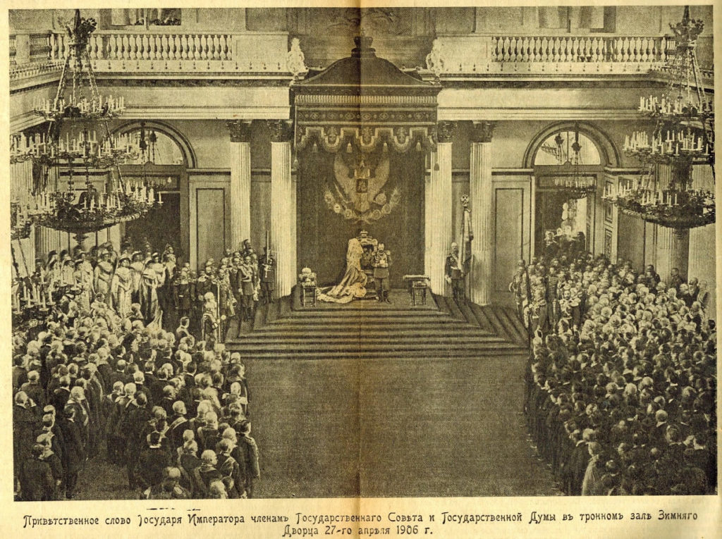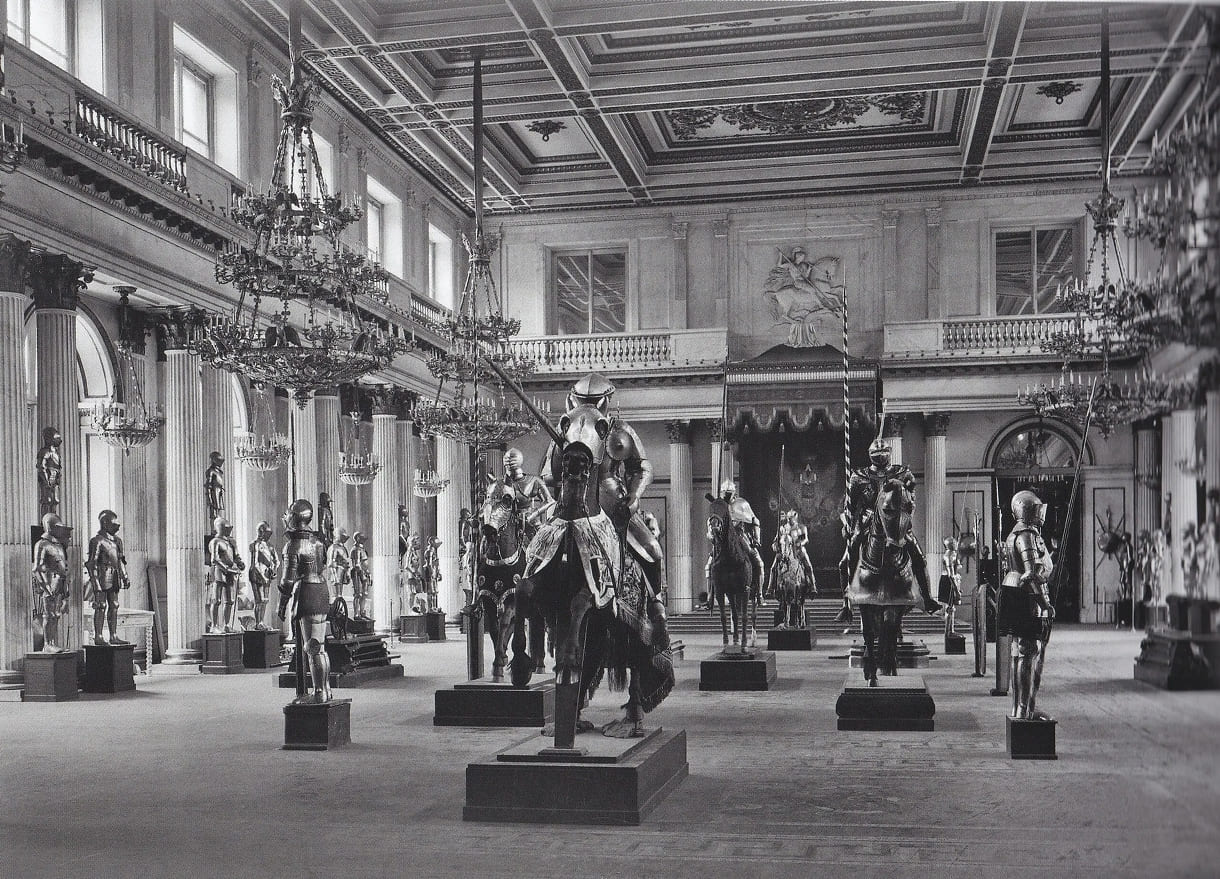 Сразу же после штурма Зимнего дворца 25 октября 1917 года началось уничтожение символов царской власти в Большом Тронном зале. С балдахина над троном сбросили корону, сняли герб, уничтожили другие элементы декора. В 1924 году зал стал первым из помещений Эрмитажа, где организовали выставку — экспонировалось средневековое оружие XV-XVII столетий. Посреди помещения поставили конных всадников, а за тронным местом, где раньше находился двуглавый орёл, разместили мечи и копья. Надпись над ними гласила, что это — оружие, которым пользовались немецкие крестьяне во время Великой крестьянской войны в 1525 году.