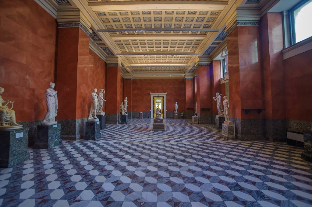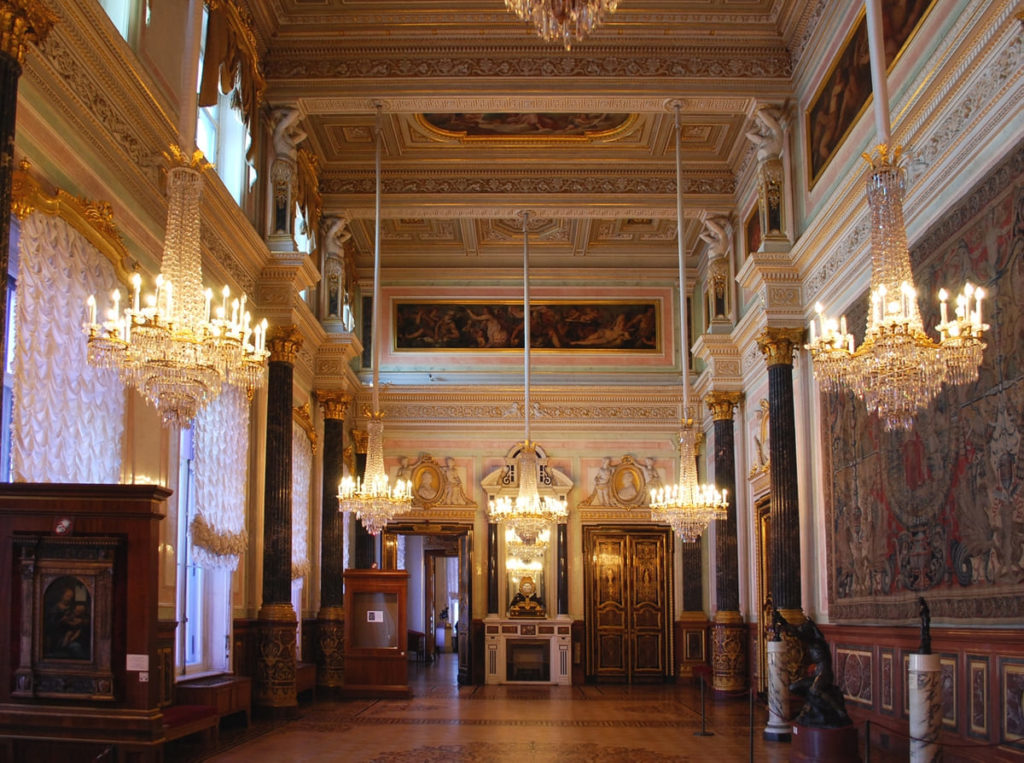 Знакомство стоит начать с залов Зимнего дворца, Малого, Большого и Нового Эрмитажа. Они удивляют не только богатством коллекций, но и архитектурным обликом, интерьерами. Во многих помещениях главного музейного комплекса сохранились первозданные элементы декора — лепнина, фрески, шторы, мебель.