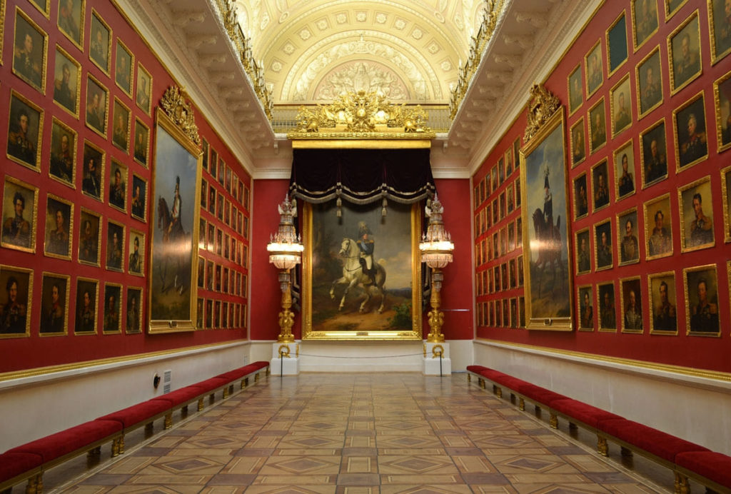 Экспозиция располагается между Гербовым и Большим Тронным залом Зимнего дворца. Здесь вы увидите 332 портрета генералов, которые доблестно сражались за родину во время Отечественной войны 1812 года. Среди них М. И. Кутузов, М. Б. Барклай-де-Толли, П. И. Багратион, Н. Н. Раевский. Картины принадлежат кисти одного художника — англичанина Джорджа Доу, которому ассистировали Александр Поляков и Вильгельм Голике. На создание полотен ушло 9 лет.