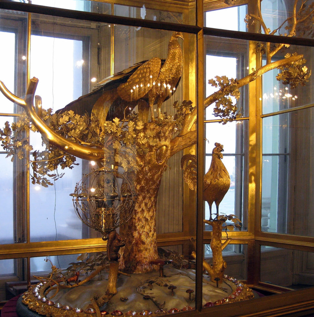 Уникальный механизм изготовили Джеймс Кокс и Фридрих Юри в 1770 году. В Эрмитаже необычные часы оказались благодаря князю Григорию Потёмкину — он купил их специально для музея. Во время транспортировки из Великобритании одна часть деталей механизма пострадала, а другая потерялась. Изобретатель Иван Кулибин смог полностью восстановить его только к 1794 году.