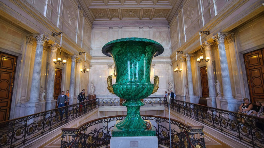Малахитовая ваза располагается на верхней площадке Советской лестницы.