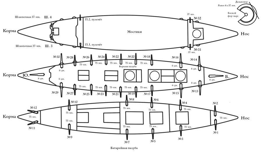 Хлынувшая в пробоины в правом борту вода нарушила равновесие крейсера, и матросам пришлось затопить расположенные у противоположного борта ямы для угля. Следующим попаданием был перебит кабель управления рулем, и корабль лишился возможности маневрировать. Однако матрос-электрик Андрей Павлович Подлесный под непрекращающимся вражеским обстрелом сумел исправить повреждения.