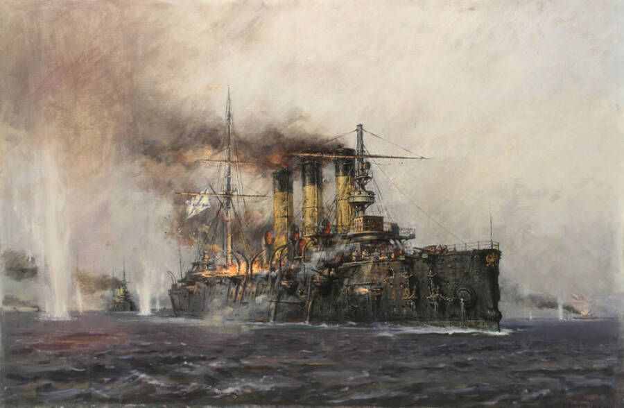 Несколько раз неприятелю удавалось сбить реявший над «Авророй» Андреевский флаг, но моряки возвращали его обратно. В конце концов, боцман прибил его к мачте, демонстрируя несгибаемую волю и русский характер. В этом сражении погиб капитан «Авроры». Более 5 тысяч моряков эскадры были убиты, ещё больше попали в плен. Корабли-броненосцы отбросили неприятеля, дав крейсеру возможность выйти из боя. Пробиться к Владивостоку уцелевшие суда не сумели и вынуждены были уйти к Филиппинам.